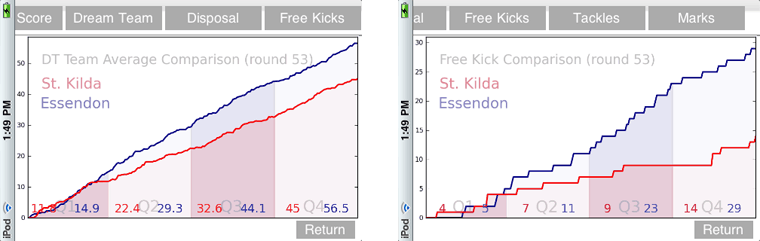 Another key feature implemented recently is the team comparison graphs. Here you'll be able to download the graphs comparing the two teams in a number of areas such as match scores, free kick counts and disposal counts.